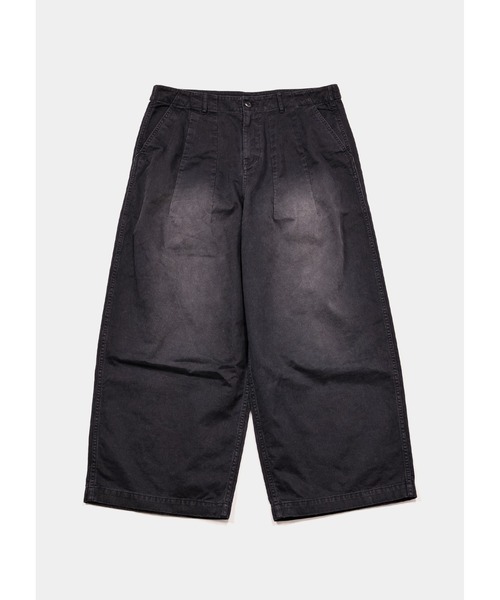 ワイドシルエットが一際目を引くミリタリーパンツ。 硫化染めの風合いが履き込んだような印象を与え、トレンド感のあるスタイリングにぴったり。 裾口(内側)に通した紐を絞ることでシルエットの変化も楽しめます。 ヒップとワタリを極端に広げたシルエットは、スタイリングに安定感を出してくれる一枚です。●ブランドのお気に入り登録完売カラーの再入荷時やラスト1点の通知を致します。●商品のお気に入り登録新商品や再入荷等、いち早くブランドの情報を受け取ることができます。ぜひご活用下さい。==========================2005年に東京でブランドをスタートし、日本のみならず世界中で高い評価を受ける〈APPLEBUM〉。A Tribe Called Questの名曲『Bonita Applebum』をブランド名の由来とし、ヒップホップの黄金期とされる80~90年代を生で体感してきた感覚をウエアに落とし込んでいる。これまでに〈STÜSSY〉や〈UNDEFEATED〉などのブランドや、アーティスト・映画といった様々なコラボレーションを実現。中でも伝説のヒップホップグループ「Wu-Tang Clan」とのコラボレーションは、彼らが影響されたカンフー映画のモチーフを日本の名産品であるスカジャンに落とし込み、90’sヒップホップを東京的解釈で発信したAPPLEBUMならではのコレクションとなった。「反骨と革新とユーモア」を哲学として掲げ、アメリカやヨーロッパのストリートと肩を並べられる、日本や東京ならではの価値観や表現を誇りに常に進化し続けているブランドである。==========================