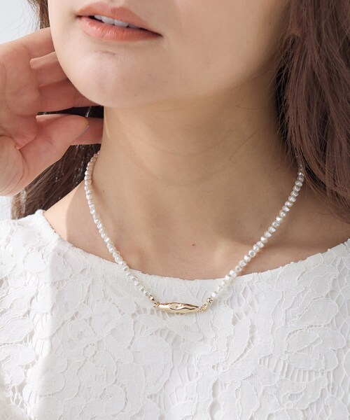 【デザインポイント】不揃いな小粒フェイクパールとメタルトップの組み合わせがこなれ感たっぷりなショートネックレスです。抜け感を意識したカジュアルな装いにもマッチするデザインに仕上げています。アジャスターはフリーで微調整が可能な仕様です。【スタイリングポイント】ニットに合わせても存在感が光ります。デイリー使いはもちろん、イベントシーズンやセレモニーにもお顔周りを華やかにしてくれます。※照明の関係により、実際よりも色味が違って見える場合があります。また、パソコン・スマートフォンなどの環境により、若干製品と画像のカラーが異なる場合もございます。店舗へのお問い合わせ商品番号:127-01203●製品寸法:00(FREE):全長39cm モチーフH0.5cm モチーフW2.5cm 付属袋H13cm 付属袋W11.5cm備考: