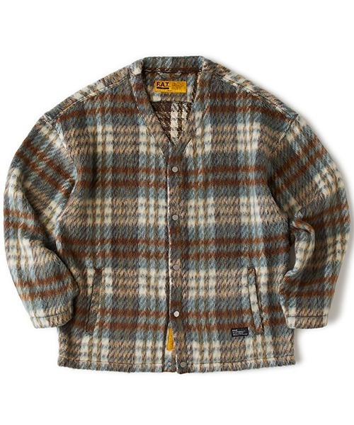モヘアライクな起毛感が特徴のチェック素材を使用したスナップカーディガン。肩幅やアームまわりを大振りにすることで、ジャケットやシャツとは異なるリラックススタイルを演出してくれる。フロント・カフスのソリッドなスナップボタンがクリーンな印象の仕上がりに。ポケット横のブランドネームが程よいアクセントに。