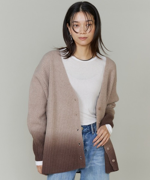 ■デザイン特殊な染色技術によって美しいグラデーションが表現されているので一枚で華やかさがあるカーディガンです。リブ編の凹凸感がグラデーションの色合いに奥行と立体感を生み出してくれるので表情豊かなカーディガン。Vネックなので顔周りをシャープな印象に見せてくれます。インナーにタートルネックやシャツなどを合わせたレイヤードスタイルを楽しめる一着です。■素材ふっくらした表面が特徴的なウール糸を使用。柔らかく、膨らみのある糸で編み上げた製品を、カラーグラデーションが出るような特殊な製品染色を施しました。・水洗い可■サンプル撮影商品画像の商品はサンプルです。実際の商品とはサイズや色味、素材、デザイン等の仕様が若干変更になる場合がございます。