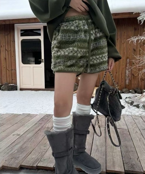 シーズンムードたっぷりなふわもこボアショートパンツが登場♪ 程よいボリューム感と肌ざわりの良いファー素材で、ルームウェアにもワンマイルコーデにもぴったり。 太もも周りにほどよくゆとりを持たせたシルエットで、脚を細く見せつつ防寒性も◎ ウエストは総ゴム+ドローストリング仕様で、ストレスフリーな履き心地が叶います。 ヴィンテージ感あるマルチカラーのファーがコーデのアクセントになり、シンプルなトップス合わせでもおしゃれ見え確実。 1枚で主役になる存在感が魅力のアイテムです! ⸻ 【POINT】 ・ふわふわの毛足がかわいいフェイクファー素材。 ・4色それぞれ異なる柄&色味で、個性派さんにもおすすめ。 ・ウエストゴム+ひもでサイズ調整が簡単。 ・ヒップ〜太ももにゆとりがあり、着心地も動きやすさも◎ ・ルームでもお出かけでもOKな万能パンツ。 ⸻ 【DETAIL】 ・素材:フェイクファー(ポリエステル) ・ウエスト:総ゴム+調整ひも付き ・裏地:なし(起毛素材で暖かさキープ) ・ポケット:サイドに2つ ・ヒップや太もも周りはややゆったりシルエット ・カラー:グレー/ピンク/グリーン/ブラウン(各柄入り) ⸻ 【おすすめコーデ】 ① ロゴスウェット+ボアショートパンツ+ムートンサンダル →おうちでもそのまま外でもOKなゆるかわルック♪ ② ダウンジャケット+ショートパンツ+ニーハイブーツ →冬の肌見せコーデももこもこ素材であったか&映える! ③ ショート丈ニット+ボアパンツ+バケットハット →ワンマイルも旅行もOKなカジュアル感が今っぽい◎ ④ スウェットセットアップ風に同色トップス+ショーパン →上下ふわもこでぬいぐるみみたいな可愛さに! 身長:155CM 着用サイズ:M ※お客様の体型や身長により写真のモデルとの着用感に多少の違いが出る場合がございます。 伸縮性:なし 透け感:なし 裏地:なし ※撮影時のライティング、ご覧になっているモニター・PC環境により実際の商品と色味異なって見える場合がございます。 ※ 実測値の為、多少の誤差ご了承下さい。 ※輸送時や梱包による、多少のシワがある場合がございます。 ※ご了承の上お買い求め下さい。