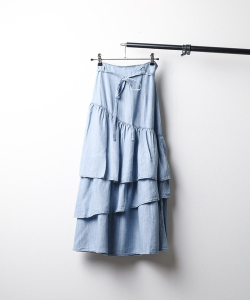 【 CIMARRON JEANS / シマロンジーンズ 】ランダムティアードスカート RANDOM TIERED SKIRT落ち感のある麻混デニムの素材は軽く涼しげです。 ランダムな巾のスカートは動くたびに裾がゆれ軽やか。 ウエストの所に共生地のリボンが通せるようになっています。 トップスはタイトや短めのコンパクトな物を選ぶとバランスよく着ていただけます。 【 CIMARRON JEANS / シマロンジーンズ 】 「CIMARRON」は1978年にスペインのSAEZ MERINO(ザエスメリノ)社によって創設されたジーンズブランドです。1990年代前半には「第2の皮膚」と称されたコットン・ストレッチデニムと後染め加工を組み合わせた画期的なカラーストレッチジーンズを生み出し、レディスストレッチジーンズのパイオニア的存在として日本市場においても2000年代に一大ブームを巻き起こしました。CIMARRON JEANSは、「CIMARRON」ブランドの特徴的なスタイルをベースとしつつ、こだわりぬいたファブリックとパターンで新鮮なアイテムを提案します。