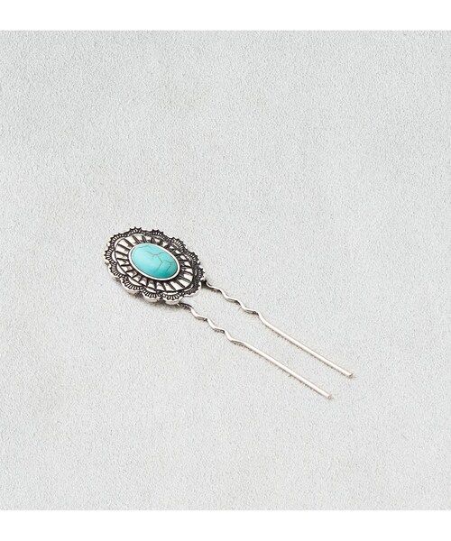 髪をまとめたり、シニヨンに飾ったり。 ターコイズカラーがアクセントのサウスウエスタン風ピン。 ターコイズ(トルコ石)、亜鉛、アルミニュウム、銅、合金 、ヘアピン、コンチョにターコイズのあしらい