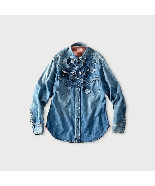 ええじゃないか♪ええじゃないか♪最上級の「遖(あっぱれ)」とはその名の通りお客様の満足を最優先にして匠の手でたっぷり時間をかけた特別な加工です。大小、それぞれお花のかたちを切り出して、花弁の枚数や、配置、重ね方に至るまでとことんこだわりぬいたフルールです。左綾の45プチデニムに白くなるまで洗いをかけ、アタリを出しました。襟先はおお花のかたちにスタッズを打ち、たくさんのお花を胸元に咲かせました。波のようなフラップポケットがアクセント。日本人の私たちがつくった、イースタンシャツです。ものづくりページはこちらこちらはオーダー刺繍対象製品です。刺繍をご希望される場合はこちらよりご注文ください。