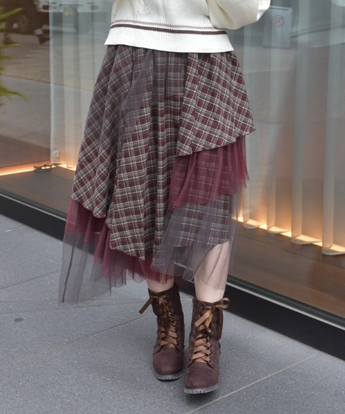 【アイテム説明】動くたびに揺れるアシンメトリーシルエットが魅力のデザインスカート。異素材を重ねた立体感のあるレイヤードデザインで、コーデの主役になるアイテムです。軽やかに揺れる裾が、カジュアルにもフェミニンにも溶け込む万能さがポイント。【デザイン】チェック柄のレイヤーにシアー素材を重ね、奥行きのあるニュアンスを表現。フロントにあしらったハトメや装飾ボタンがアクセントとなり、シンプルトップスと合わせても華やかな印象に。ウエストはゴム仕様でラクな着心地ながら、美しいフレアラインをキープしてくれます。【スタイリング】スウェット合わせでカジュアルミックスに、ブラウスとならフェミニン寄りに、シャツやショート丈トップスと合わせればモードな雰囲気にも。ブーツや厚底シューズとの相性も抜群で、様々なテイストで楽しめる着回し力◎の優秀スカートです。▽ axes femme * アクシーズファム【Concept】axes femmeのお洋服であなたのライフスタイルにほんの少しだけ彩る花が咲きますように。ブランドを通して、彩る花たちが、人と人、お客様や作り手たちの想いが世界中に繋がっていきますように。ベル・エポック(フランスの古き良き時代)にパリジェンヌたちが愛したファッションや文化にルーツをおき、独自のフェミニンスタイルを楽しむブランド**********************.。.: お気に入り登録のおすすめ :.。.∇気になるアイテムを登録∇ハートをクリックしてお気に入りに登録すると完売カラーの再入荷やラスト1点の通知、セールの通知を受けとることができます。∇ブランドを登録∇新商品や再入荷、セール通知など、いち早くブランドの情報を受けとることができます。是非ご利用頂き、お買い物をお楽しみ下さい。.。.: 商品について :.。.・サイト上のカラー名と、お届け商品に記載されているカラー名が異なる場合がございます。・商品の色味は、撮影場所や光のあたり具合、お客様のお使いのPCのモニター環境などにより色味が違って見える場合がございます。予めご了承の上ご注文下さい。.。.: 返品・キャンセルについて :.。.・着用、洗濯後の返品は致かねます。・商品到着後、着用前に商品を確認して頂きますようお願い致します。
