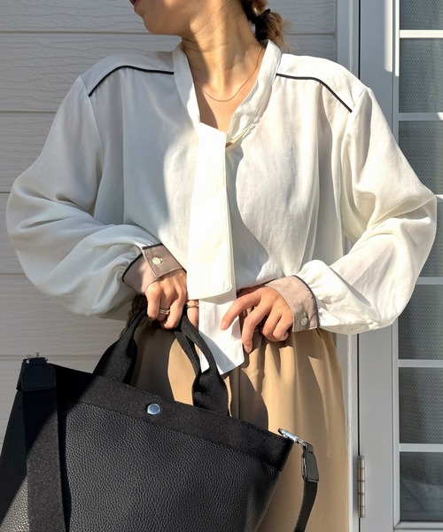 バイカラーのパイピングが施され、上品な印象を与えつつ、ボウタイがアクセントになるブラウスです。きれいめなスタイリングにも最適で、オフィスシーンからカジュアルなおでかけまで幅広く活躍します。トレンドを取り入れつつ、合わせるボトムでクールにもエレガントにも着こなせるこのブラウスは、毎日のコーディネートにも活躍するアイテムです。※商品の色味は、撮影場所や光のあたり具合などにより色味が違って見える場合がございます。 また、ご覧のモニター環境や撮影環境により実際の商品と多少色味が異なって見える場合がございます。 予めご了承の上ご注文下さい。《インフォメーション》◆商品のお気に入り登録完売していても再入荷時に再入荷通知を受け取ることができますので、是非ご登録ください。◆ブランドのお気に入り登録新商品や再入荷などの情報を受け取ることができますので、是非ご登録ください。