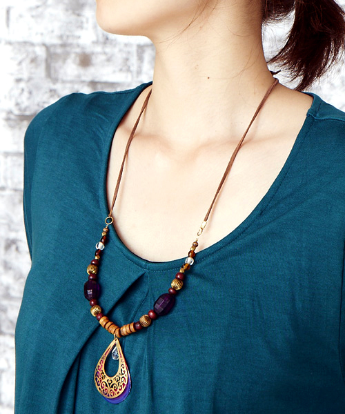 ドロップの透かしモチーフからのぞく深いカラーが魅力的なボリュームネックレス。コーディネートのアクセントに♪コード部分がレザーとウッド素材ですので金属アレルギーの方にも優しい仕様です◎ ※こちらの商品は、職人による手作りとなります。その為、形や色に多少の誤差が生じる場合があります。ご了承ください。Amina Collection Co.,LTD.