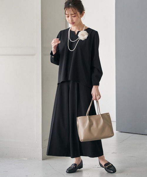 バックシャントップスとフレアパンツがセットになった2点セット。 上下別々でも使いやすく、コーディネートの幅が広がります。 ちょっとしたお呼ばれや学校行事など、きちんと見せたいシーンに最適。 ストレッチ性のある素材で快適な着心地を叶えつつ、上品な印象を演出します。 【素材】 上品なジョーゼット見えする、中肉ストレッチの効いたカットソー素材です。 【デザイン】 後ろ身頃にタックをふんだんに入れたバックシャントップスとフレアーパンツ。 【ikkaポイント】 ・トップスは前後身頃にタックを取った新デザイン ・キーネックデザインでフェミニンな印象 ・ボトムは足のシルエットが出にくく腰回りもカバー ・ボトムはウエストゴム仕様で履き心地が楽 フォーマルにも使える マシンウォッシャブル [洗濯方法] 洗濯の際はネットを使用してください