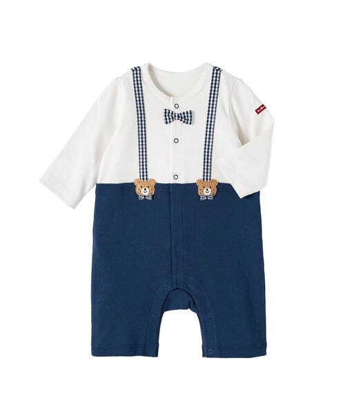 ミキハウス ホットビスケッツのカバーオール(ロンパース)。サスペンダーと蝶ネクタイをつけたようなカバーオールです。蝶ネクタイがついたデザインで、おでかけにぴったり![素材感]Tシャツ部分はさらっとした肌触りで通気性がよく、汗をしっかりと吸収し丈夫な天竺素材。パンツ部分はやわらかなフライス素材。………………………………………伸縮性:あり生地:Tシャツ部分 綿100%袖丈:長袖おすすめ着用シーズン:春秋………………………………………●前ホックで股下まで全開するので、お着替えやオムツ替えも便利●お尻はゆったりマチつきで、活発なお子さまの動きを妨げません《HOT BISCUITS ーホットビスケッツー》ミキハウスホットビスケッツは、”Good Quality”がキーワードのブランド。子どもたちには毎日ごきげんに、楽しく健やかに 過ごしてほしいから、お子さまのための良いものづくりを大切にしています。男の子も女の子も子どもらしく、おしゃれに可愛く着られるアイテムがいっぱい。赤ちゃんからキッズまでの子ども服・ベビー服・ベビー用品等を幅広くご用意しています。春夏秋冬の季節に合わせた、ご出産祝いやプレゼント、ギフトもおすすめです。