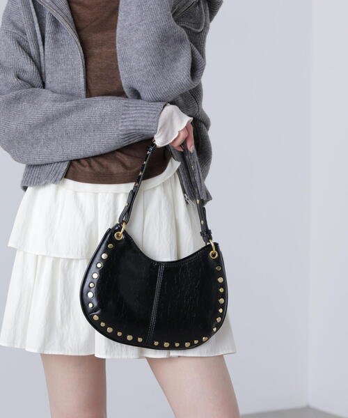 ころんとしたフォルムが可愛らしいスタッズ付きバッグ。 手持ちハンドルと肩掛けできるチェーンショルダーが付いている2way仕様。 アクセサリー感覚で持てるデザインです。 ※モデルの着用画像の場合、光の当たり具合により、実際の色味と異なって見えることがございます。色味は、商品単体の画像をご参照ください。