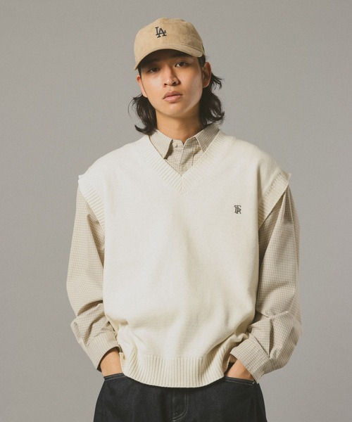 ーーー■ポイントベーシックなワンポイント刺繍を施したニットベスト。首元は広がりのあるVネック仕様で、レイヤードスタイルに最適なディテールに。肩幅や身幅を広くとったトレンド感のあるオーバーサイズで仕上げました。アームホールを広くとることで厚手のインナーとも問題なく重ね着可能です。ユニセックスでおすすめの一着。■素材ニット特有のチクチクとした感覚の少ない、肌触りのいいニット素材を採用。程よくハリのある清潔感溢れるニット素材は大人っぽいスタイルを実現。シワにもなりづらくイージーケアなのも嬉しいポイント。======■参考サイズM:~175cmL:175cm~======ーーー