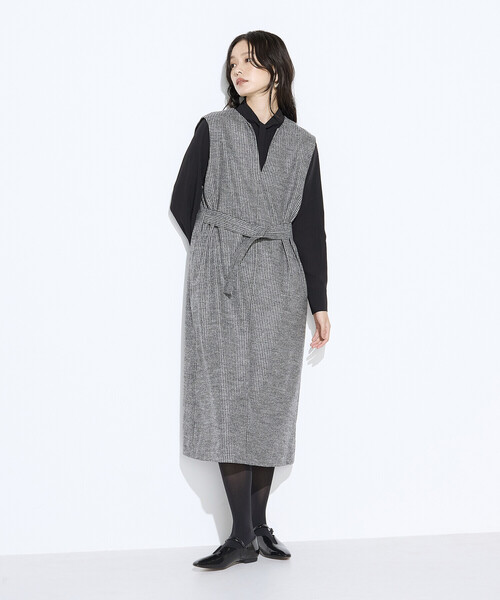 《デザイン》 上品な千鳥バランサーで仕立てた大人のジャンパードレスの登場です。 細見え効果の期待できる、美シルエットで裾に向かい程よく広がりを持たせたIラインの絶妙な 肩幅です。 アームホールにはゆとりを持たせているため、ニットなどとの相性も抜群です。 キーネックラインの首元で女性らしさをプラスしています。 襟ぐり、袖ぐりには配色の別布使いでWフェイスのような仕上げです。 調整可能共布ベルト付きで、ベルトは前でウエストマークと後ろで留めるリラックススタイルの2WAYでお楽しみいただけます。 着るだけで今っぽさが手に入る、秋冬のマストドレスです。 お持ちのニットやブラウスと合わせて、幅広い着こなしをお楽しみください。 《素材》 ジャージーの着心地と布帛のきちんと感を両立する千鳥柄バランサーで、今年は上品で細かく繊細な柄に仕上げています。 ジャージーにたて糸をプラスした特殊な編みのバランサーはジャージーよりも形態安定性に優れ、布帛のようなすっきりとしたシルエットをつくりジャージーとは思えない程のグレード感です。 バランサー編み機の中でもジャカードは超希少で、布帛にも劣らない高級感が特長です。 ジャージーならではの軽さとストレッチ性で着心地も抜群のシンプルでトラッドなモノトーン調です。 ジャージーの産地、和歌山県産です。 お手入れ方法:手洗い可