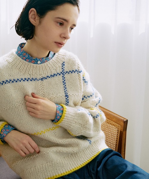 遊び心のある配色ラインが表情豊かなアルパカニットざっくりと手編みで仕上げた、アルパカウールのクルーネックプルオーバー。柔らかく軽やかな着心地で、1枚で冬スタイルの主役になる存在感。襟・袖・裾に入った配色ラインがアクセントになり、カジュアルながらも上品な印象です。肌触りの良さとあたたかさを兼ね備えた、特別感のある1枚です。コーディネート【シャツ】インにシャツを重ねて、襟元や裾をのぞかせたレイヤードスタイルもおすすめ。【スカート】フレアスカートと合わせて、優しい印象のリラックスフェミニンに。【パンツ】マリンパンツやデニムで、軽快な冬のカジュアルスタイルに。※照明の関係により、屋外で撮影した写真の商品は、実際よりも色味が違って見える場合があります。またパソコン・スマートフォンなどの環境により、若干製品と画像のカラーが異なる場合もございます。予めご了承ください。実際の商品の色味は、スタジオ撮影の画像をご参照下さい。※商品画像はサンプルのため、色味やサイズ等の仕様に変更がある場合がございますので、予めご了承ください。アイテム詳細素材:毛 (アルパカ)65%,毛35%サイズ: 【F】 着丈:57cm,身巾:54cm,肩巾:50cm,天巾:20cm,袖巾:19cm,袖丈:54cm,袖口巾:8.5cm,裾巾:45cm====================裏地:なし透け感:なし生地の伸び:あり光沢感:なしケア方法:ドライクリーニング====================生産国:ペルー品番:92545002※取り扱い・ケア方法については、商品についている品質表示でご確認ください。