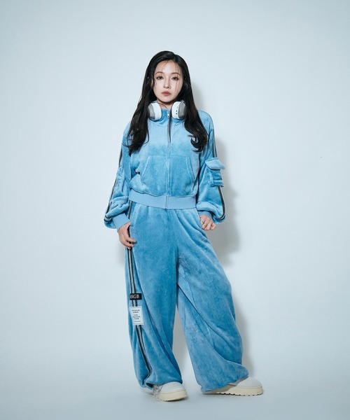 ボア素材で仕立てた、着心地よさ抜群のセットアップ。シンプルながらもサイドに入ったラインやロゴがアクセントに。上下セットなので、そのまま着るだけでこなれ感のあるスタイルが完成します。