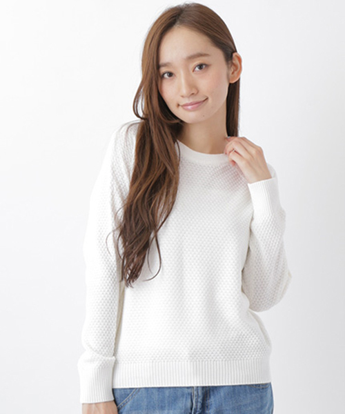 タック編みのざっくりとした凹凸のあるプルオーバー。スカートでもパンツでも合わせやすい丈感が◎。インにシャツを着て衿出しコーデもお勧めです。
