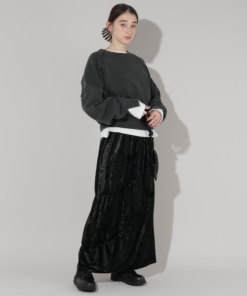 ベロア素材のティアードスカートです。 ■DESIGN ・アシンメトリーな切替が特徴のティアードスカート ・程よいボリューム感のフレアシルエット ・ウエストゴムで履き心地も快適 ■FABRIC ・クラッシュベロア素材を使用し、光沢感と表情のある見え方に ■STYLING ・比較的女性らしいデザインなので、スウェットやパーカーなどのカジュアルアイテムとの相性も◎ ・ゆったりしたニットなどを合わせた抜け感のあるスタイリングもおすすめ ※サンプルにて撮影をしておりますので、実際の商品とは仕様や加工・サイズ等が若干異なる場合がございます。 ※屋外の光や照明の当たり具合で、実物と色味が異なって見える場合がございます。詳細画像の色味をご確認ください。 なお、商品の色や質感を出来るだけ忠実に再現するよう心掛けておりますが、パソコンなどの環境により、実物と若干異なる場合がございます。 ※写真を許可無くコピー・転用することは固くお断りします。