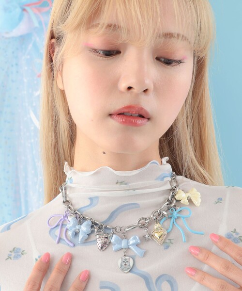 かわいいをふんだんに詰め込んだデザイン ■デザイン 猫好きにはたまらない、〈Lovely Charm 22(ラブリーチャームトゥエンティトゥー)〉のステンレス製ネックレス。猫をトップに、いちごやリボン、ハートなどのキュートなチャームをふんだんに使用した、他にはないチャーミングなデザインが魅力です。アジャスターにも猫チャームが付いており、後ろ姿まで可愛く演出できます。〈CAROLINA GLASER(カロリナ グレイサー)〉のみオリジナルのデザイン。アジャスター付きで長さ調節も可能です。 ■コーディネート デイリーからパーティーまで、シンプルな装いを一気に華やかでキュートなスタイリングに仕上げてくれます。 原産国:最終加工地:日本 (部品原産国:韓国) 【アクセサリー・小物雑貨の取り扱いについて】 ・貴金属は、体質により、かゆみやかぶれを生じる場合があります。 ・皮膚に異常を感じた場合は直ちにご使用を止め、専門医にご相談下さい。 ・家事やスポーツ、就寝時や乳幼児の世話をする時などは、身体に危害を及ぼす場合がありますので着用を避けて下さい。 ・熱伝導が高いので、高温の場所や寒冷地での着用は火傷や凍傷の原因となりますので着用を避けて下さい。 ・乳幼児が誤飲しないように、保管は十分にご注意下さい。 ※画像の商品はサンプルのため、実際の商品と「仕様」「色味」が異なる場合がございます。 Lovely Charm 22 / ラブリーチャームトゥエンティトゥー "色×色"の組み合わせで新しい自分に。 コーディネートに色はかかせません。 「色×色の組み合わせ」をテーマに、ネックレスやピアス、ブレスレットなど、コーディネートに取り入れやすいアクセサリーを展開しています。 犬猫保護シェルターへのサポートやプラスチックフリーの取り組みなども行っています。 CAROLINA GLASER / カロリナ グレイサー シンガーでありデザイナー、同世代の女性より多くの支持を集めるインフルエンサーでもあるMEGが手掛けるブランド。2014年12月より、BEAMSがプロデュースをスタート。スタンダードなアイテムにトレンドを取り入れて、今の気分をすぐ身につけられるウェアをオンラインショップで提案。