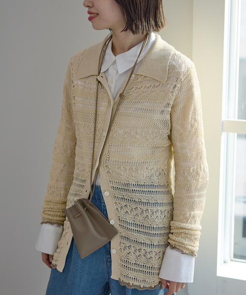 手洗い可能/ボタン開き 【2026SS】 SLOBE IENA POINT レーヨン混の風合いのある糸を使用した幾何柄のレース編みニット。 【素材の特徴】 さらっとした素材で透け感があるので先々まで着やすいカーディガン。 【デザイン】 衿のディテールと配色がポイントの春らしい1着。 【コーディネート】 ロンTEEと重ねてレイヤードするのもおすすめ。 透け感があるのでヘルシーで女性らしくスタイリングできます。 ********************** 透け感:あり 裏地:なし 伸縮性:あり 光沢感:なし 生地の厚さ:やや薄手 ********************** 【スタッフ着用コメント】 《スタッフ名:Yuka》 年齢:20代後半/身長:172cm/体型:細身/普段サイズ:M~L/着用サイズ:フリー サイズ感:袖丈は長めでずるっとしています。ウエストが隠れるくらいの着丈。程よく身体にフィットするようなサイズ感。 素材感:素肌にそのまま当たってもチクチク感はなく着やすいです。 着心地:さらっとしているので夏手前くらいまで着られそうで、1枚着からレイヤードまで着回しできそうです。 ********************** ※取り扱いについては、商品についている品質表示でご確認ください。 こちらの商品は、SLOBE IENAでの取り扱いになります。 直接店舗へお問い合わせの際はSLOBE IENA店舗へお願い致します。 ※照明の関係により、実際よりも色味が違って見える場合があります。 またパソコン・スマートフォンなどの環境により、若干製品と画像のカラーが異なる場合もございます。 予めご了承ください。 ※商品の色味は、商品アップ画像をご参照ください。 本体:手洗い可能