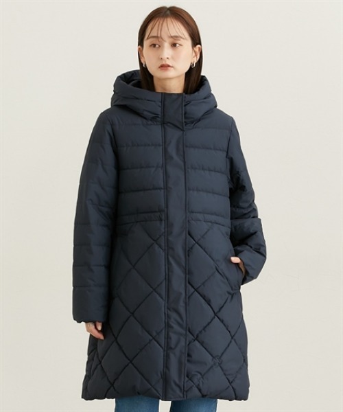 【防風・保温性・はっ水機能付】軽くてあったか高機能ファイバーダウンコート■デザイン・軽さと暖かさが人気のファイバーダウンコート・着ぶくれしないキルティング仕様が人気のデザイン・ウエスト裏にスピンドルゴム入りなので調整しててウエストシェイプさせてもすっきり・フロントはボタンを裏側に隠す仕様なので 見た目もすっきり。ファスナーも付いているのでしっかり閉じて暖かさ◎・衿部分も少し高めの設定で防寒仕様。フードにもゴム・スピンドル付きで調整可能・フードは取り外しできない縫込み仕様です・便利な両脇ポケット付。ポケット内側は起毛トリコット生地でひんやりせずあったか◎■素材表地・ファイバーダウン・ファイバーダウンパック裏地の4層になった生地を使用しているので軽さと暖かさの両立が叶うアイテム。お家で手洗い可能なのでお手入れしやすくきれいに使えます。■おすすめのスタイリングオフの日にはデニムを合わせてカジュアルにオンの日にはきれいめパンツ合わせで通勤にももちろんOK着回し力もすごいアイテム。この冬一押しのアウターです。<仕様>ポリエステル100% 前開きファスナー・ボタン 透け感:なし伸縮性:なし生地の厚み:厚い光沢感:ややあり裏地:あり(総裏)ポケット:あり(両脇)季節:冬シルエット:普通<洗濯方法>手洗い■キーワード20代、30代、40代、あったか、お仕事、きれいめカジュアルきれかじ、アウター、オフィスカジュアル、キレカジ、コートダウンジャケット、ファッション、フード、レディース、冬大人、大人カジュアル、機能性、通勤カジュアル、防寒洗える素材、洗えるアウター、お手入れ簡単、フード付きアウター