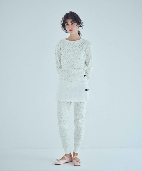 どこか懐かしい小花柄が散りばめられた、サーマルを使用したシリーズ。お腹周りをしっかりホールドしてくれる、ハイライズのレギンス。 股下部分には、可動域を広げるガゼットクロッチを使用。 スポーツウェアにも使われる仕様で、足を大きく広げても、生地がつっぱらない快適な履き心地に。 ヴィンテージ感漂うウエストゴムと、ウエストにレイアウトしたSeavalleyのニットパッチがアクセントに。