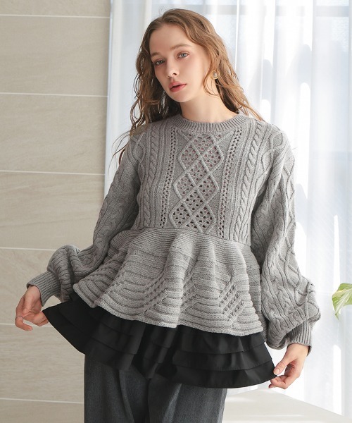 ■商品名 Donoban ケーブルフレアニット ■サイズ(cm) 【OneSize】 身幅 約47.5、肩幅 約46、袖丈 約58.5、着丈 約60 ※平置き採寸のため若干のブレがございます。 ■生地感 透け感:あり、裏地:なし、伸縮性:あり、ポケット:なし ■カラー ブラック、アイボリー、グレー、ベージュ ■素材 アクリル 60%、コットン 40% ■商品説明 立体感があり表情あるケーブル編みのペプラムシルエットが、スタイルアップを叶えてくれるニットトップス。 クラシカルなアラン編柄が縦のラインを強調してくれるので、ウエストとヒップラインをさり気なくカバーしてくれます。 Donobanオリジナルのミルフィーユチュチュやバレリーナチュチュとのレイヤードスタイリングもオススメです。 ■モデル身長 詳細は商品画像をご覧ください。 ■ご注意 ■入荷時期によりお色、長さが多少異なる場合がございます。 ■撮影場所やイメージにより実際の商品と色味が若干異なる場合がございます。商品のお色味はカラーバリエーション画像をご参照ください。 ■なるべくきれいな状態で発送致しますが、製造工程上、輸送の際の汚れや擦れ等が若干見られる場合がございます。 ■雨、摩擦により色落ちする場合がございます。 あらかじめ上記事項をご理解ご了承のうえ、お買求めくださいませ。 ~*~*~*~*~*~*~*~*~*~*~*~*~*~* ▼商品のお気に入り登録▼ 完売カラーの再入荷通知や、ラスト1点の通知、 セールの通知も受け取ることができます。 ぜひご登録ください♪ ▼ブランドのお気に入り登録▼ 新商品や再入荷など、 ブランドのお得な情報をいち早くお知らせ! ぜひご登録ください♪