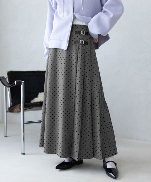 ドット柄が女性らしいプリーツスカート◎■おすすめの着こなし☆MIDDLE(Mサイズ)を着るなら・・・そのまま着用するのはもちろん、デニムやスラックスにレイヤードするのもおすすめです。ミドル丈なので、スウェット×スニーカーなどと合わせる、カジュアルなスタイルにもぴったり◎短すぎない丈感なので、大人見えも叶います。☆LONG(Lサイズ)を着るなら・・・シャツやブラウスをインナーに着込み、ニットと合わせるきれいめスタイルが◎上からコートを羽織ればより落ち着いた印象で着用いただけます。デニムやスラックスをレイヤードする、今年らしい着こなしもおすすめです。■ポイントきれいに広がるプリーツで、大人見えするドット柄スカート。丈感を選べる2サイズ展開なので、お好みのスタイルに合わせて着用いただけます。サイドにあしらったフェイクWベルトがアクセントになるので、インスタイルが映えるのも嬉しいポイント。ウエストはバックゴム入りなので、長時間穿いても楽な穿き心地◎全面に散りばめられたドット柄が女性らしさを際立たせてくれるアイテムです。ベーシックなカラーバリエーションなので、トップス次第で幅広いスタイルを楽しめるのもポイントです。■素材つるっとした生地感で、穿き心地のよい素材を使用。さらさらとした肌触りで、ロングシーズンお使いいただけること間違いなしなアイテムです。