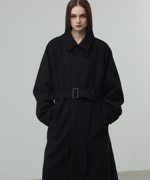 CALLNEらしいミニマルで洗練されたルックスが魅力のステンカラーコート。 気分やシーンに応じてマルチウェイで着こなせる一着です。 ■design/silhouette 無駄なディテールをそぎ落としたシンプルなデザインで、大人の洗練された印象を演出。 ラグランスリーブとロング丈のオーバーサイズシルエットにより、程よく抜け感のあるリラックススタイルが完成します。 フロント前立ては比翼仕上げで、上品かつスマートな印象。両脇ポケットに加え、袖口タグベルトやスタンドネックにアレンジ可能なチンストラップを搭載し、防寒性と機能性を両立しました。 また左胸裏にチンストラップを収納できる仕様で、使わないときもミニマルにまとめられます。 取り外し可能な腰ベルトは、垂らしてラフに、またはウエストマークしてメリハリをつけるなど、自由なスタイリングが楽しめます。 ■material/color 表地には毛羽立ちが少なく、程よい厚みで手触りの良いメルトン生地を使用。 素材のハリが美しいシルエットを生み出しつつ、滑りの良い光沢裏地で快適な着心地を実現しました。 合皮バックルやマーブル調の柄釦がさりげないアクセントに。合繊素材で肌触りも優しく、デイリーユースに最適です。 カラーはシーンを選ばず着回せるブラックを厳選しました。 ■styling/coordinate プリントスウェットやモヘアニット、ビッグシルエットアイテムの上からさらっと羽織るだけで、ラフかつ洗練されたスタイルに。 定番のハイネックやタートルネックとのシンプルなレイヤードや、落ち着いたスーツやジャケットスタイルにも好相性です。 ボトムスはベーシックなデニムやチノパン、ワイドスラックスなど幅広く対応。カジュアルからきれいめまで幅広く活躍する、汎用性の高い一着です。 【注意事項】 お手入れやお洗濯はタグや本体内側の洗濯表示をご参照ください。 この商品は、摩擦(特に濡れた状態での摩擦や汗、雨などで濡れた時)は他の衣類や下着に(特に白物)に色移りすることがありますので、十分ご注意下さい。 素材の特性上、他の物に引っかかりやすいのでご注意して下さい。 摩擦やひっかき作用でも毛玉ができやすいのでご注意下さい。毛玉はハサミや毛玉取り器で取り除いて下さい。 日光や照明に長時間あたると変色の原因になりますのでご注意下さい。 ■動画着用モデル model:172cm size:L ■CALLNE/カルネ 静けさを纏う洗練されたスタイルを展開。 ■商品のお気に入り登録 完売カラーの再入荷通知や、ラスト1点、セールの通知をお知らせいたします。 ■ブランドお気に入り登録 新商品や再入荷など、いち早くブランドの情報を受け取ることができます。