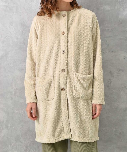ふんわり柔らかな肌触りが魅力のノーカラーガウン。 冬らしい編み目模様が型押しされたおしゃれなデザイン。 薄手なのでもたつきのないすっきりした着用感、しっかりあたたかさを実感できる1枚。 お尻まですっぽり隠れる丈感なので、朝晩の冷え対策やゆったりしたおうち時間に最適です。 両サイドには手を温めたりスマホを入れることができるポケット付きなのも嬉しいポイント。 カラーはアイボリーとサックスの2色展開です。ーーーーーーーーーーーーーーーーーー 裏地:なし ポケット:あり 透け感:なし ーーーーーーーーーーーーーーーーーー ※本品に付いているご注意書きをお読みの上ご使用ください。 ※実物の色味に近づけて撮影していますが、ご使用の端末やモニター環境により、実際の色味と異なって見える場合がございます。 ▼お気に入り登録をおすすめします▼ 商品のお気に入り登録 完売カラーの再入荷通知や、ラスト1点の通知、セールの通知などお得な情報が受け取れます! ブランドのお気に入り登録 新商品や再入荷など、いち早くブランドのお得な情報を受け取ることができます。