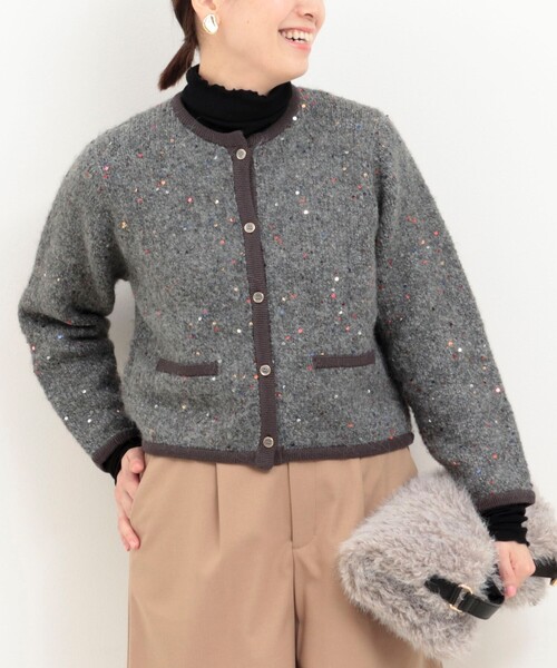 ◇25AW◇MICO COULIER着るだけで華やぐスパンコールカーディガン◆Point・カラフルなスパンコールを散りばめた華やかデザイン・アルパカ混の滑らかでふっくらとした編地で、軽くてあたたかく快適な着心地・ご自宅で手洗い可能なイージーケア素材・ノーカラー×パイピング仕様で、スッキリと上品な印象・ニットジャケットのようなきちんと感がありつつ、軽やかに羽織れる・フロントの飾りポケットもさりげないアクセント・スカートやワンピースと合わせてフェミニンにスラックスやワイドパンツで大人っぽいスタイルに、デニムと合わせて大人カジュアルにと様々なテイストで着ていただけます・シンプルなスタイルに羽織るだけで、冬のイベントやお出かけシーンに映える華やかさを演出するアイテム<同素材シリーズ>カラフルスパンコールVネックプルオーバー(5-0803-6-02-217)----------------------------------------------------------透け感:なし裏地:なし伸縮性:あり光沢感:ややあり洗濯:手洗い可----------------------------------------------------------気になる商品は、お気に入り登録がオススメです!クーポン情報、入荷情報が通知されるようになります----------------------------------------------------------●お取扱い上のご注意● 末永くご愛用頂くために、アテンションタグを必ずご確認の上、着用又はお取り扱い下さい。※店頭及び屋外での撮影画像は、光の当たり具合で色味が違って見える場合があります。商品の色味は、スタジオ撮影の画像をご参照下さい。※商品画像に関しては出来る限り忠実に表示出来るよう努めておりますが、お客様がご利用のモニターの設定及び特性により、実際の商品と比較し色味に若干の誤差が生じる場合があります。※製品洗い加工の商品は、多少の歪み、シワなどが見られたり、風合いやサイズ等が1枚1枚異なります。汗や雨等で濡れた時や、摩擦により色落ちし、他の衣料を汚すことがありますので(特に濃色のもの)ご注意ください。