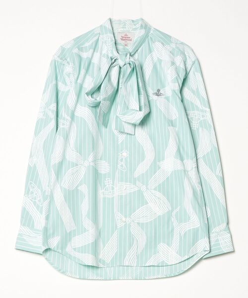 リボンとオーブがプリントされたファンシーなデザインのシャツ。長めにデザインされたボウタイは様々なアレンジでコーディネートに変化をプラス。