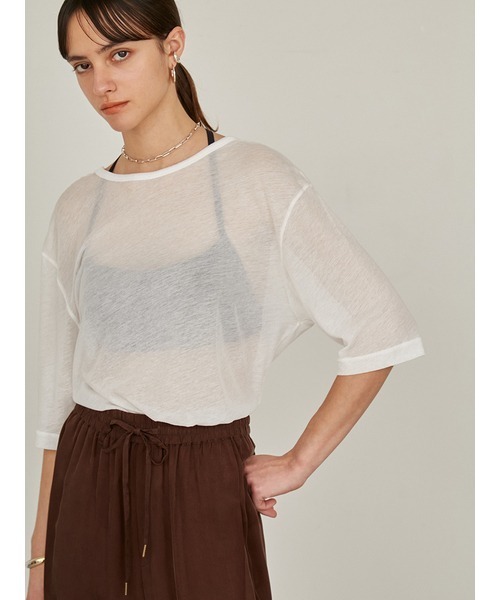 【Design/Styling】 素材とサイジングにこだわったstyling/らしいベーシックTシャツ。 細番手の超強撚糸を使用し、斜行仕上げで編み立てた日本国産カットソー素材を使用しています。 繊細さが魅力なのはもちろん、さらっとした肌触りで長時間の着用も快適です。 肘が隠れるミドルスリーブで安心感があり、クルーネックと深めのラウンドネックのどちらも楽しめる前後2WAY仕様になります。 衿にはしっかりとした素材を使うことで、シアーボディーとのコントラストを出した仕立て映えする一着に仕上げました。 別売りのカップ付きアシンメトリータンクトップとのレイヤードスタイルや、インナーとしても活躍するアイテムです。 透け感:WHTのみ-ややあり 生地の厚さ:普通 裏地:なし 伸縮性:あり ※照明の関係により、実際よりも色味が違って見える場合があります。 またパソコン・スマートフォンなどの環境により、若干製品と画像のカラーが異なる場合もございます。予めご了承ください。 商品の色味は、商品単品画像をご参照下さい。 ※商品画像はサンプルのため、色味やサイズ等の仕様に変更がある場合がございますので、予めご了承ください。