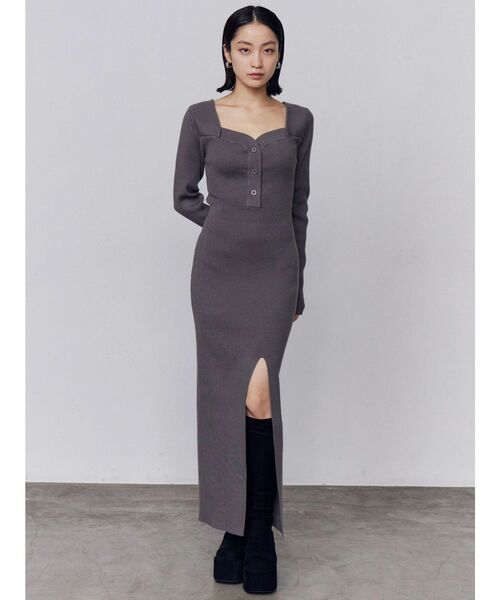 女性らしい印象を与えるフィットマキシワンピース■デザインハートネックとフロントボタンのディテールが女性らしい印象。ハイウエストの切り替えで縦長のラインを強調し、深めのスリットで足元を綺麗に見せてくれます。伸縮性がありつつも身体のラインを拾いすぎないので、タイトですが着用しやすいです。■スタイリング女性らしい印象のワンピースなので、寒い時期にはフェイクレザーオーバーブルゾンのようなカジュアルな印象のアウターを合わせたバランスがおすすめ。ネック周りは広めなので、ネックレスも映えるワンピースです。※着用画像はフラッシュの加減で実際の製品と色味等が異なる場合がございますので、生地のズームアップ画像をご確認ください。 ※ご利用の端末画面の設定により実際の商品と色味が異なる場合がございます。【商品特徴】透け感:なし伸縮性:ややあり生地の厚さ:普通サイズ感:細身裏地:なしポケット:なし