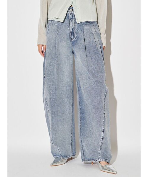 PANEL TUCK DENIM WIDE PT フォルム感のあるワイドデニムパンツ。 ダブルタックと切替えを入れ膝にかけてたっぷりとボリュームを取ったシルエット。 裾に向けて幅をややせまくし、ソフトなコクーン状にフォルムをつけているデザイン。 12オンスのデニムにブリーチ剤をスプレー状にふりかけ、ムラのあるヴィンテージライクな加工感に。 濃いめのネイビーカラーが大人っぽいインディゴと極限までブリーチをした抜け感のあるアイスの2色展開。 ウエストまわりはコンパクトに仕上げ、トップスをタックインしても様になるメリハリシルエット。 ・・・・・・・・・・・・・・・・・・ 透け感:なし 裏地:なし 伸縮性:なし 生地の厚さ:やや厚い ・・・・・・・・・・・・・・・・・・【 お買いものにおすすめの便利機能! 】▽商品のお気に入り登録完売カラーの再入荷時や、ラスト1点の時、セール開始時にお知らせします。 ▽ブランドのお気に入り登録新商品や再入荷、セール情報など、いち早くブランドのお得な情報を受け取ることができます。ぜひご活用ください。 ※実際にお届けする商品と仕様やサイズが異なる場合がございます。また生産の都合上、お届け時期が前後する場合がございます。