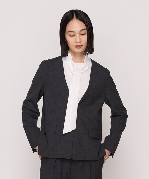 《デザイン》プルオーバーのような着こなしができる新感覚のジャケットです。ファスナーを閉めるとシャープなラインの深Vネックですっきりとした印象のプルオーバーになります。ファスナーを開けるとノーカラーのジャケットとして着用できる2WAY仕様です。同素材のパンツ(商品番号:34-06PI09-204)と合わせてプルオーバーアップとして着用でき、新しいオフィススタイルとして提案したいスタイリングです。肩パッドは入れず、柔らかな着心地ながら前を開けたときにもしっかりと決まるようにこだわっています。(商品番号:34-60EI08-204)の刺繍Tシャツを中に着ると、Vラインにちょうどスパンコール刺繍がビスチェのように見えるようにしています。色も合わせているのでぜひ一緒にご着用ください。《素材》トップ調の深みのある色表現と、さらにツイル組織で凹凸があり、奥行きのある生地です。ウール混のポリエステルという風合いを感じながらも、取り扱いのしやすさ、2WAYストレッチの着心地の良さが特長です。糸は綿の状態から精紡と撚糸を同時に行って作るサイロスパンという糸を使用しています。毛羽立ちが少なく、クリアで上品な光沢感の柔らかさ、しなやかさが特長です。お手入れ方法:手洗いOK