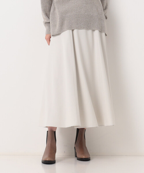 《デザイン》この時期に重宝するウール混のフレアスカートです。コンパクトなハリとドレープ性を併せ持つ素材で仕立てる事で美しいシルエットを 実現しています。少しハイウエストの設定なので脚長効果が期待できます。六枚接ぎの接ぎ線でダーツ分を取り、腰周りはすっきりさせつつ 裾に向かってたっぷりと広がる華やかなスカートに仕上ています。後ろウエストは中心部分だけゴムギャザーにすることでホールド感のある 楽な着心地です。《素材》ベネシャン組織による光沢と滑らかな手触り、ウール混による上質さと温かみが特徴の生地です。程良いハリがありながらも落ち感がある素材です。