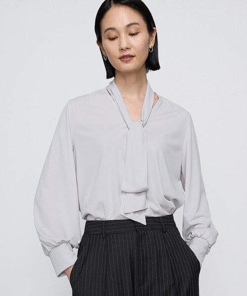 アレンジ自在のブラウス■人気のポイント■・タイの結び方をアレンジしてこなれ感を出したり、タイ無しで着たり、いろいろな変化を楽しめます。・落ち感のあるジャージー素材でジャケットインしてもしわにならず、肌触りもよく着心地も良いです。・しわになりにくく、吸水性と速乾性にも優れ、イージーケアが可能なブラウスです。《デザイン》ボウタイについているメタルパーツはコムサオリジナルのパーツです。繊細なコムサのロゴや、馬蹄風の溝のデザイン、ジュエリーの様な光沢感の メッキの美しさなど、通常の付属とは一線を画す、グレード感のある仕上がりです。リングの大きさも、タイの太さとアレンジを考慮し、タイを一本で通したり、 二本で通したりして検討を重ね、一ミリ単位で楕円の大きさを調整したこだわりの仕上がりです。メタルパーツはニッケルフリーで、アレルギーが出にくいことが特長です。きらりと光るメタルパーツが華やかさを演出し、他には無いボウタイブラウスです。適度な深さのVあきと、程良いボリューム感のギャザー袖が女性らしさを演出します。きれいめで、落ち感のあるジャージー素材でジャケットインしてもしわにならず、着心地も抜群です。ブライトリーストライプのセットアップ(15-80GI03-204、15-80PI05-204)と合わせて着ると、マニッシュコーディネートに華やかさを加えます。5WAYで着られるブラウスで、タイ無しで着られるのに加え、 タイの結び方が三パターンあり、マニッシュなタイ風、くるりと巻いて前後にタイをたらすスカーフ風、スカーフ風巻きを前に垂らす巻き方、こなれ感の出る片蝶結び風があります。巻き方で雰囲気が変わるので、 シチュエーションや気分で変化を楽しめます。《素材》強撚の糸を使用したシャリ感のあるスムース素材です。 コンパクトな目面で布帛の様なきれい目な印象です。適度な肉感もありますが、そこまで厚くなく、オールシーズン活躍する素材です。吸水性と速乾性にも優れており、イージーケアの素材です。お手入れ方法:手洗い可