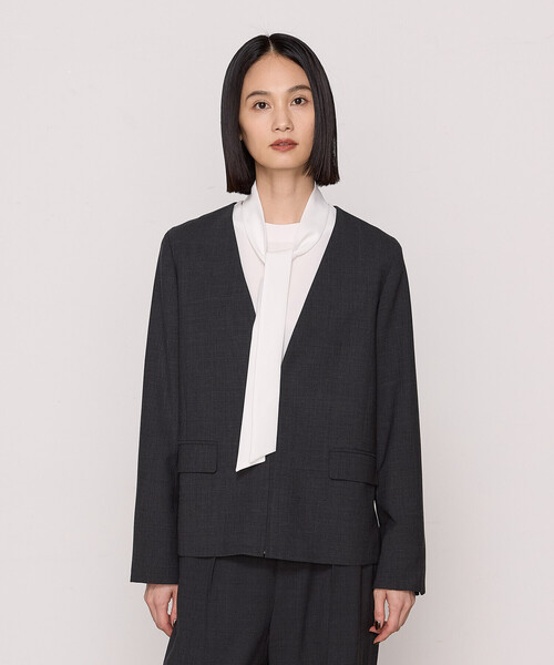 《デザイン》プルオーバーのような着こなしができる新感覚のジャケットです。ファスナーを閉めるとシャープなラインの深Vネックですっきりとした印象のプルオーバーになります。ファスナーを開けるとノーカラーのジャケットとして着用できる2WAY仕様です。同素材のパンツ(商品番号:54-06PI09-204)と合わせてプルオーバーアップとして着用でき、新しいオフィススタイルとして提案したいスタイリングです。肩パッドは入れず、柔らかな着心地ながら前を開けたときにもしっかりと決まるようにこだわっています。(商品番号:54-60EI08-204)の刺繍Tシャツを中に着ると、Vラインにちょうどスパンコール刺繍がビスチェのように見えるようにしています。色も合わせているのでぜひ一緒にご着用ください。《素材》トップ調の深みのある色表現と、さらにツイル組織で凹凸があり、奥行きのある生地です。ウール混のポリエステルという風合いを感じながらも、取り扱いのしやすさ、2WAYストレッチの着心地の良さが特長です。糸は綿の状態から精紡と撚糸を同時に行って作るサイロスパンという糸を使用しています。毛羽立ちが少なく、クリアで上品な光沢感の柔らかさ、しなやかさが特長です。お手入れ方法:手洗い可