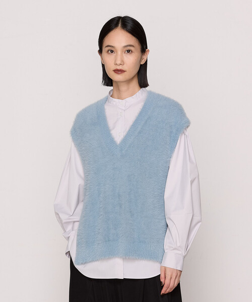 《デザイン》イタリアの最上級フェザーヤーンを使用した、今年はニューデザインのニットベストとなっております。前身頃はリッチな毛足を楽しむ天竺編み×深めのVネック、後ろ身頃はフリンジの様なジャカード編み×ラウンドネックのデザインです。前後どちらでも着られるので、インするアイテムに合わせてコーディネートが楽しめます。《素材》<マイクロナイロンフェザー>イタリア[PINOLI社]が開発した、マイクロナイロンを使用した長い毛足が特長のフェザーモールです。鮮やかな発色と上品な光沢感があり、非常に柔らかく肌触りが良いのが特長です。<バソランウールブレンド>防縮加工したウール糸とアクリルを混紡した、柔らかく、しわになりにくいイージーケア素材です。《注意事項》多少縮むことがありますが、手洗い後に形を整えてから日陰で平干ししてください。ハンガーに掛けたまま保管しますと自重による伸びが発生しますので避けて下さい。