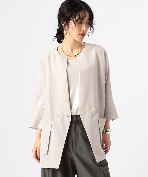 《デザイン》シャツよりきちんと、ジャケットより抜け感をだしています。さらっと羽織るだけでさまになる、新しいアイテムです。お袖は、ゆったりとしたドルマンスリーブです。後身頃はタックを取ってふんわり仕上げています。窮屈さのないデザインとサイズ感が今年の気分です。《素材》麻混で涼しくしわになりづらい生地です。木材パルプが主原料のアセテートは環境に配慮した素材です。リサイクルポリエステルを混ぜ、生地の耐久性もアップしています。天然素材のドライな風合いを活かして織り上げています。たて糸よりよこ糸が太いタッサーという織り方は丈夫で綿糸で織ったものは、旗やのれん、法被の生地などにも使われます。お手入れ:手洗い/ドライクリーニング/ウェットクリーニング