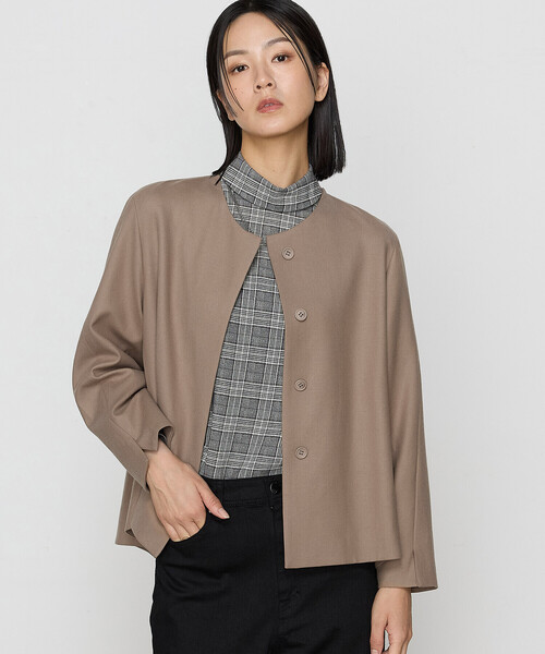 《デザイン》様々なシーンに着まわせる汎用性を持ち合わせたブルゾンタイプのフラノジャケットです。フラノのグレード感とモード感を持ち併せた、新型ノーカラーブルゾンでお仕事からプライベートまでおしゃれに彩る新しいフラノです。丸みのある構築的なシルエットで薄い芯を全面に貼り、丸みのあるフェミニンモードなシルエットをつくります。前はしっかりした芯を貼り、ボックスシルエットで凛とした印象です。後ろはしなやかな芯を貼り、軽やかなAラインでフェミニンをプラスしています。ショルダースリット入りノーカラーです。後ろはチビスタンドできちんと感と着心地の良さをプラスしています。後袖にボリュームのあるカーブを持たせた前振りの二枚袖がモード感を演出しています。完全釦レスにできる2WAY比翼仕立てです。前を開けた時にも釦レスを叶えるオリジナル比翼仕様です。グレーは見返しを黒にし、凛とした印象です。《素材》触れただけで上質を感じさせる美しい光沢と軽さ、しなやかさがあります。上質なスーパー120ウール・細い糸でつくる薄く、柔らかく、繊細で丁寧な加工は日本独自の技術です。毛織物では日本一を誇る愛知県で制作した日本のフラノです。日本の丁寧な物つくりをお届けします。着る時に”ふわり”とした独自の軽さと柔らかさが特長です。タテ・ヨコ共に伸びる2WAYストレッチで着たままお仕事ができる程の抜群の着やすさです。ウール系とポリウレタン糸を特殊な紡績・撚糸で合わせたウールストレッチ糸をタテ・ヨコ共に使用しています。あらゆる動きについてゆく伸縮性と膨らみを持たせています。厚くなりがちな2WAYストレッチを日本の技術で薄く軽く仕上げています。