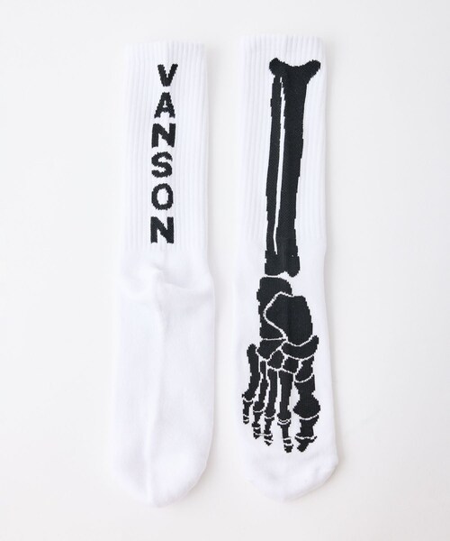 アメリカ老舗ブランドの VANSON から登場したこのジャガードソックスは、ブランドらしい無骨でインパクトのあるデザインが特徴。 “ボーン&ロゴ” をあしらった柄は、足元からストリート感やバイカー感を演出し、服装のアクセントとして申し分ありません。 厚みのあるしっかりとした生地感で、スニーカーにはもちろん、ブーツとの相性も抜群。耐久性・履き心地に優れ、デイリー使いからライディング、アウトドアまで幅広く活躍します。 また、デザイン性が高いためギフトにも最適で、普段の服装に個性と存在感をプラスしたい方におすすめです。 SIZE: FREE (25-27cm) 【VANSON /バンソン】 アメリカの老舗レザーメーカー/ウェアブランドで、モーターサイクルジャケットやレザーアイテムを中心に展開し、その耐久性と男らしいデザインで多くのファンを持つブランドです。 タフな素材使いと無骨でワイルドなデザインは、バイカー文化やストリートファッション、ワークスタイルなど幅広いジャンルで支持されています。 機能性と存在感を兼ね備えるアイテムが多く、使い込むほどに味わいが増す“本物志向”のライフスタイルブランドです。