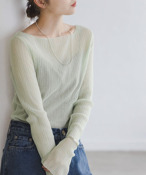 プリーツ調に編んだ柔らかい質感のシアーニット。縦方向にも伸びやすく、着たときに身体にすっと馴染んでくれるような質感なので、インナー使いから1枚でもお勧めのニットに仕上がっています。生地に凹凸感があり上品な透け感に映るので、何にでも合わせやすく大人のスタイリングの抜け感作りにも最適。お袖をクシュっとたくし上げて着るのもこなれ感が生まれ、春先まで重宝すること間違いなし。使勝手の良いブラック・グレーB・ホワイトのベーシックカラーに加え、NEWシーズンの新鮮なムードを満喫するグリーンBの4色展開。※ブラックはWEB限定での展開となります。**********************透け感:あり裏地:なし伸縮性:あり光沢感:なし生地の厚さ:薄手**********************【スタッフ着用コメント】年齢20代/身長:155cm/体型:やや細身/普段サイズ: 34~36 /着用サイズ:フリーサイズ感:ボディにややフィットするすっきりとしたサイジング。伸縮性があるので、身体に馴染んで着用できます。着丈は長くヒップが隠れるほどの長さ。素材感:ドライタッチで夏前まで着られそうな風合い。着心地:エアリーでさらりとしています。透ける素材なので、インナーで遊ぶのもGOOD◎**********************※取り扱いについては、商品についている品質表示でご確認ください。※こちらの商品は、NOBLEでの取り扱いになります。直接店舗へお問い合わせの際はNOBLE店舗へお願い致します。※照明の関係により、実際よりも色味が違って見える場合があります。またパソコン・スマートフォンなどの環境により、若干製品と画像のカラーが異なる場合もございます。※商品の色味は、商品アップ画像をご参照ください。ブラック着用スタッフ身長:163cm 着用サイズ:フリーグレーB・ホワイト着用スタッフ身長:155cm 着用サイズ:フリーグリーンB着用スタッフ身長:164cm 着用サイズ:フリーモデルサイズ:身長:164cm 着用サイズ:フリー本体:手洗い可能