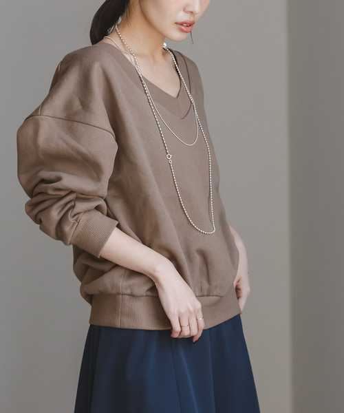 裏起毛の膨らみのあるカットソー素材を使用した大人のスウェットが完成。目の詰まったキレイな表面感の素材を選んでいるのでスウェットのカジュアル感を軽減し、リラックス感がありながらも大人の女性が着やすい一品に。大胆に開いたVネック開きで女性らしいデコルテラインを強調しつつ、肩もオーバーに落として着用するだけで抜け感が生まれます。ニュアンス感のあるシルエットでさらっと1枚で着用したくなるアイテムです。デコルテ開きがしっかりあるのでネックレスなど小物でのアレンジもお勧め。**********************透け感:なし裏地:なし (裏起毛)伸縮性:あり光沢感:なし生地の厚さ:普通**********************【スタッフ着用コメント】年齢20代/身長:155cm/体型:やや細身/普段サイズ: 34 /着用サイズ:フリーサイズ感:身体が泳ぐゆったりとしたサイジング。デコルテは見えますが、肩が落ちない程度のネック加減。着丈はヒップが隠れる程度の長さ。素材感:肌当たり柔らかなコットン素材。着心地:裏地が起毛なので暖かく着用できます。Vネックが深めなので、抜いて着るかインナー着用がおすすめです。**********************※取り扱いについては、商品についている品質表示でご確認ください。※こちらの商品は、NOBLEでの取り扱いになります。直接店舗へお問い合わせの際はNOBLE店舗へお願い致します。※照明の関係により、実際よりも色味が違って見える場合があります。またパソコン・スマートフォンなどの環境により、若干製品と画像のカラーが異なる場合もございます。※商品の色味は、商品アップ画像をご参照ください。ブラウンD・ベージュ着用スタッフ身長:155cm 着用サイズ:フリーモデルサイズ:モデルサイズ: 身長:163cm 着用サイズ:フリー本体:手洗い可能