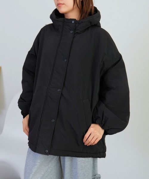 スタンドカラーで首回りまでしっかり暖かい中綿ダウンジャケット。 女性らしい丸みとボリュームのあるフォルムで冬に活躍する事間違いなし。 オーバーなサイズ感なのでニットなど厚手のインアーにももたつきにくいです。