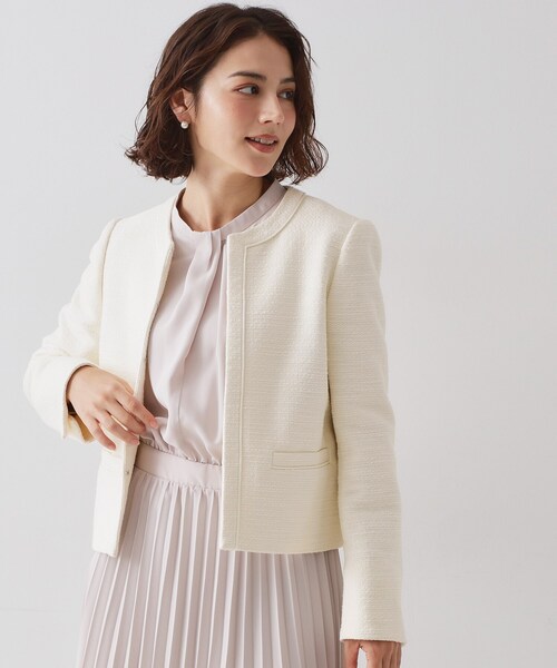OPAQUE.CLIP NAVYDELEGANT(デレガント)社製の素材を使用したツイードジャケット【デザイン】・コンパクトな着丈とシンプルなデザインで、ボトムスを選ばず合わせやすいジャケット。・ポケット口・衿ぐりから前立てにかけて、細身のコードをあしらったきれいめなデザインです。・ワンピースやテーパードパンツを合わせれば、入学式・卒業式などのセレモニースタイルにも活躍します。・コットンツイードの素材なので、通勤やデニムなどを合わせたきれいめカジュアルスタイルもおすすめです。・フロントは目立ちにくいホックで留める仕様なので、前をあけて着用するのもおすすめです。【素材】・素材メーカー、DELEGANT(デレガント)社のファブリックを使用。・ツイード部分にはコットン100%の素材を使用しており、光沢感がありすぎず柔らかな印象。・裏地付きの仕様で、長いシーズン活躍します。【仕様】・ポケット数:横×2・裏地:総裏仕立てこの商品の表地はフランスで企画し、中国で製造された生地を使用しています。---------------【OPAQUE.CLIP NAVY/オペーク ドット クリップ ネイビー】「ハレの日の特別な装い」をコンセプトに、想い出に残る大切なワンシーンを彩るアイテムを提案するレーベル。通勤からセレモニー、パーティー等のシーンに対応した、良質感と華やかさのあるスタイルを提案します。※照明の関係により、実際よりも色味が違って見える場合があります。また、パソコン・スマートフォンなどの環境により、若干製品と画像のカラーが異なる場合もございます。モデル情報:身長162cm B83 W60 H84 着用サイズ:38(M)店舗へのお問い合わせ商品番号:637-45032●製品寸法:36(S):着丈49cm B97cm 袖丈56cm 肩幅38cm 裾103cm38(M):着丈50cm B100cm 袖丈57cm 肩幅39cm 裾106cm40(L):着丈52cm B103cm 袖丈58cm 肩幅40cm 裾109cm42(LL):着丈52cm B106cm 袖丈59cm 肩幅41cm 裾112cm備考:重量:約550g(サンプルサイズ)