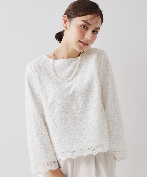 OPAQUE.CLIP NAVY華やかなレース素材を使用した、プルオーバー型のブラウス【デザイン】・プルオーバー型のブラウスで、一枚でもジャケットを着ても決まるシンプルなデザイン。・お袖と裾はスカラップを残した仕様で、レースの華やかさを楽しめます。・首の後ろには貝調ボタンをあしらい、ボタンを開けて着脱する仕様。・お仕事やお出かけにはもちろん、入学式・卒業式などのセレモニースタイルにも最適な一枚です。【素材】・華やかなレース素材を使用。・総レース仕立てでシンプルながら上品な印象のアイテム。・ご家庭でのお手入れが簡単なマシンウォッシャブル。【仕様】・裏地あり---------------【OPAQUE.CLIP NAVY/オペーク ドット クリップ ネイビー】「ハレの日の特別な装い」をコンセプトに、想い出に残る大切なワンシーンを彩るアイテムを提案するレーベル。通勤からセレモニー、パーティー等のシーンに対応した、良質感と華やかさのあるスタイルを提案します。※照明の関係により、実際よりも色味が違って見える場合があります。また、パソコン・スマートフォンなどの環境により、若干製品と画像のカラーが異なる場合もございます。モデル情報:身長162cm B83 W60 H84 着用サイズ:38(M)店舗へのお問い合わせ商品番号:637-85043●製品寸法:36(S):着丈47cm B98cm 袖丈48cm 肩幅38cm38(M):着丈48cm B101cm 袖丈49cm 肩幅39cm40(L):着丈50cm B104cm 袖丈50cm 肩幅40cm42(LL):着丈50cm B107cm 袖丈51cm 肩幅41cm備考: