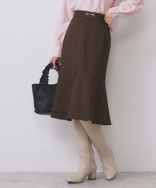 カルゼツイードが織りなす新鮮なアシメフレアスカート【デザイン】・アシメトリックなフレアシルエットが、女性らしい美しさを引き立てます。・ウエストにはさりげないアクセントとなる金属パーツを採用。・スカートの裾にかけて広がるデザインが、動きのある上品な印象を与えます。・背面に施されたゴム入りとダーツが美しいラインを作り、立体感とリラクシーな穿き心地を叶えます。・シンプルなカルゼ地が目を引く無地と千鳥チェックのアソート展開で、様々なトップスとコーディネートしやすいアイテムです。【素材】・軽やかな穿き心地が魅力。程よくしなやかで動きやすく、長時間の着用でもストレスフリーです。・防シワ性で美しいシルエットをキープし、イージーアイロンの機能でお手入れも楽々。・マシンウォッシャブル仕様で日常使いしやすいのはもちろん、抗ピリング加工により長く愛用できるのもポイントです。【仕様】・ポケットなし・左脇ファスナー・ウエスト後ろゴム・裏地あり※照明の関係により、実際よりも色味が違って見える場合があります。また、パソコン・スマートフォンなどの環境により、若干製品と画像のカラーが異なる場合もございます。モデル情報:身長168cm B81 W60 H89 着用サイズ:38(M)店舗へのお問い合わせ商品番号:C58-74015●製品寸法:36(S):W60~64cm H86cm 総丈70cm38(M):W62~66cm H88cm 総丈71cm40(L):W64~68cm H90cm 総丈72cm42(LL):W66~70cm H92cm 総丈73cm備考: