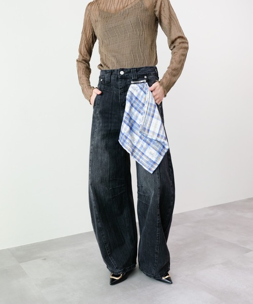 遊び心のあるアクセントとシルエットが魅力のトレンド感あふれるデニムパンツ【Material】程よくハリのあるデニム素材を使用。穿くほどに馴染む風合いが魅力で、オールシーズン着用可能。ウォッシュ加工による絶妙な色落ちがヴィンテージライクな雰囲気を演出します。 【Design】立体的なカーブラインで構築したバルーンシルエットがポイント。膝部分のタックが自然な丸みを生み、ボリューム感がありながらもスッキリと見えるデザインに。フロントには取り外し可能なチェック柄ハンカチをプラスし、コーデに遊び心を添えます。バックスタイルはシンプルに仕上げ、どの角度から見てもバランスの取れた1本。 【Size】ウエストは程よくフィットし、ヒップや太ももにかけてゆったりとしたワイドフォルム。立体的なパターン設計で脚のラインを拾わず、リラクシーなはき心地ながらスタイルアップも叶えます。 SサイズとMサイズの2サイズ展開です。ブルーSサイズ ウエスト70cm ヒップ99cm 股下72cmMサイズ ウエスト74cm ヒップ104cm 股下72cmブラックSサイズ ウエスト70cm ヒップ101cm 股下73cmMサイズ ウエスト74cm ヒップ105cm 股下73cm※1枚1枚加工しているため、色や形、サイズにそれぞれ差があります。【Styling Point】シンプルなTシャツやスウェットと合わせるだけでトレンドライクに決まります。シャツやジャケットを合わせれば大人カジュアルな着こなしに◎スニーカーからブーツまで幅広いシューズと好相性な万能アイテムです。___________________________★商品のお気に入り登録 完売カラーの再入荷通知や、ラスト1点の通知、セールの通知も受け取ることができます。是非ブランドの”お気に入り登録”もご一緒にお願い致します!!! ※画像の商品は光の反射や角度により、実物と色味が異なる場合がございます。 また、表示のサイズ感と実物は若干異なる場合もございますので、予めご了承ください。 ※着用、お取り扱いの際は、商品についている品質表示とアテンションタグを必ずご確認ください。-DOLLUPOOPS | ドールアップウップス-【Add a little essence】ライフスタイルの多様化が進む現代変わり続ける今をとらえ、自分らしい感性を大切にする女性に向けて" より美しく" 毎日を" 彩る" ワードローブを。日常に調和しつつ、" 普通 " に少しだけエッセンスをたして、他にない特別な一品を提案します。-Instagram-公式インスタグラム【dollupoops.tevalt_official】※商品のサイズ感やご質問は【dollupoops.tevalt_official】のインスタアカウントDMにて承っております。お気軽にご相談くださいませ