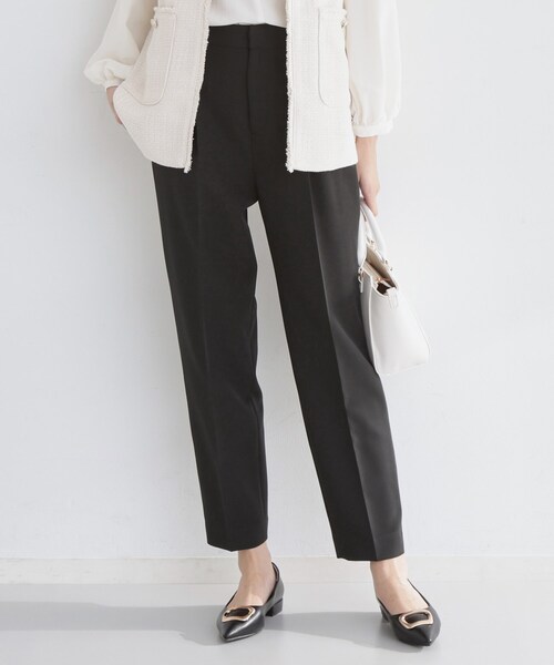 ■ポイント/詳細ダブルクロスの柔らかくしなやかな素材を使用したこのパンツは、テーパードシルエットで足首まですっきり伸びるキレイなラインが特長です。センタープレスが効いたディテールと、前開きファスナー仕様により、ウエストやヒップ周りに無駄なギャザーを作らず、スタイリッシュに着こなせます。ウエストの後ろにはゴムが配されているため、着用中も楽にフィットします。■素材/機能性マシンウォッシュ、イージーケア、防汚加工が施された高機能ダブルクロス素材を採用。しなやかで軽やかな着心地ながら、耐久性やお手入れのしやすさを両立。■おすすめスタイリングこのパンツは、ブラウスやニットなど、幅広いデザインのトップスと相性が良く、オフィスカジュアルからフォーマルシーンまで自在にコーディネート可能です。さらに、040‐45003(ダブルクロスノーカラージャケット)や040‐25001(ダブルクロスペプラムジレ)とのセットアップで着用することで、統一感ある洗練されたスタイルが完成し、入学式、卒業式、オフィスシーンなど、特別な日にもおすすめのアイテムです。【仕様】・ポケット数:横×2 後ろ×2・前ファスナー・ウエスト後ろゴム・裏地なし※照明の関係により、実際よりも色味が違って見える場合があります。また、パソコン・スマートフォンなどの環境により、若干製品と画像のカラーが異なる場合もございます。モデル情報:身長171cm B77 W59 H87 着用サイズ:12(M)店舗へのお問い合わせ商品番号:040-65002●製品寸法:11(S):W67cm H96cm 股下64cm 前股上31cm 渡り幅31cm 裾幅16cm12(M):W70cm H99cm 股下66cm 前股上31cm 渡り幅32cm 裾幅17cm13(L):W73cm H102cm 股下67cm 前股上32cm 渡り幅33cm 裾幅17cm14(XL):W76cm H105cm 股下67cm 前股上32cm 渡り幅34cm 裾幅18cm備考:
