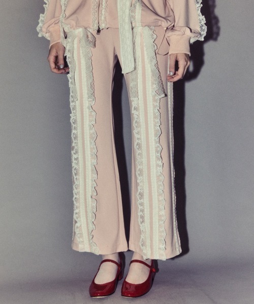 コットンレースとチュールレースを随所にあしらいデコラティブに仕上げたトラックパンツ。程よい肉感のエステルポンチを使用し軽やかな着心地。ウエストはゴム仕様&程よいワイドシルエットでリラクシーなシルエットに。同シリーズのトラックジャケットを組み合わせた着こなしもオススメ。ベビードールなど女性らしいアイテムと相性◎ガーリーな着こなしにぴったりなパンツに仕上がりました。・ ・・・・・・・・・ ・・・・・・・・・透け感:なし・伸縮性:あり・生地の厚さ:やや薄手・裏地:なし・ ・・・・・・・・・ ・・・・・・・・・ピンク、グレー、ブラック/黒の3色展開☆セットで可愛い、同シリーズのブルゾンは『1259608』で検索!【サイズ展開】・FREE(フリーサイズ)#カジュアル#ガーリー#リボン#フリル#セットアップ#ウエストゴム#キャンスト#キャンスパ#CND●Candy Stripper/キャンディストリッパー●-BRAND CONCEPT-NO RULE, NO GENRE, NO AGE年齢や性別にとらわれず、自由に自分を表現出来る服【お買い物をもっとお楽しみ頂くために】▼商品のお気に入り登録▼完売カラーの再入荷通知や、ラスト1点通知、プライスダウンしたセール通知も受け取れる♪▼ブランドのお気に入り登録▼新作や再入荷等、いち早くブランドのお得な情報が受け取れる♪